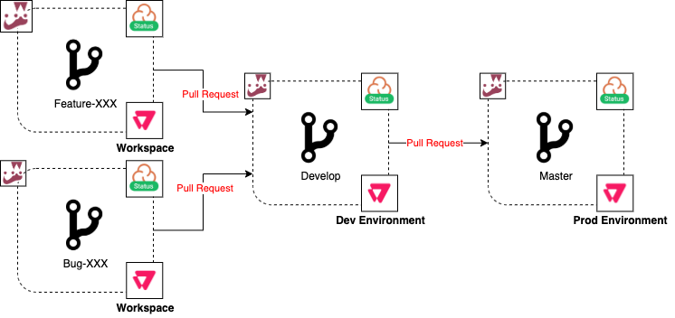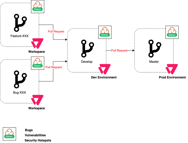 Para la entrega de software en nuestros canales de ecommerce que utilizan VTEX, se ha definido el siguiente flujo, el que considera análisis de código mediante el uso de Sonarqube